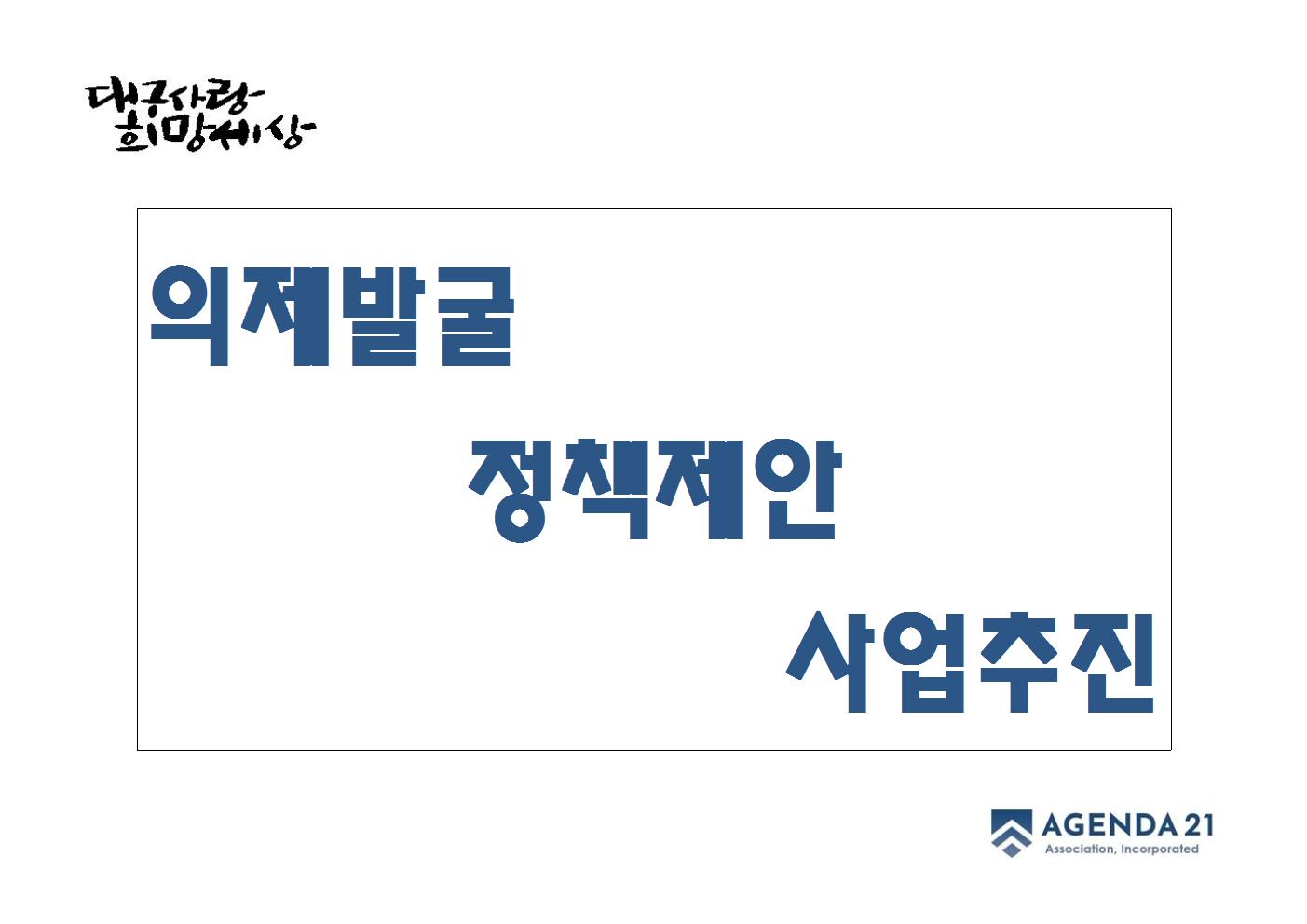 (사)아젠다21은 '건전하고 성숙한 시민사회'를 추구하며 '대구사랑 희망세상'을 실천하고자 의제발굴, 정책제안, 사업추진을 꾸준히 해나갈 것입니다.