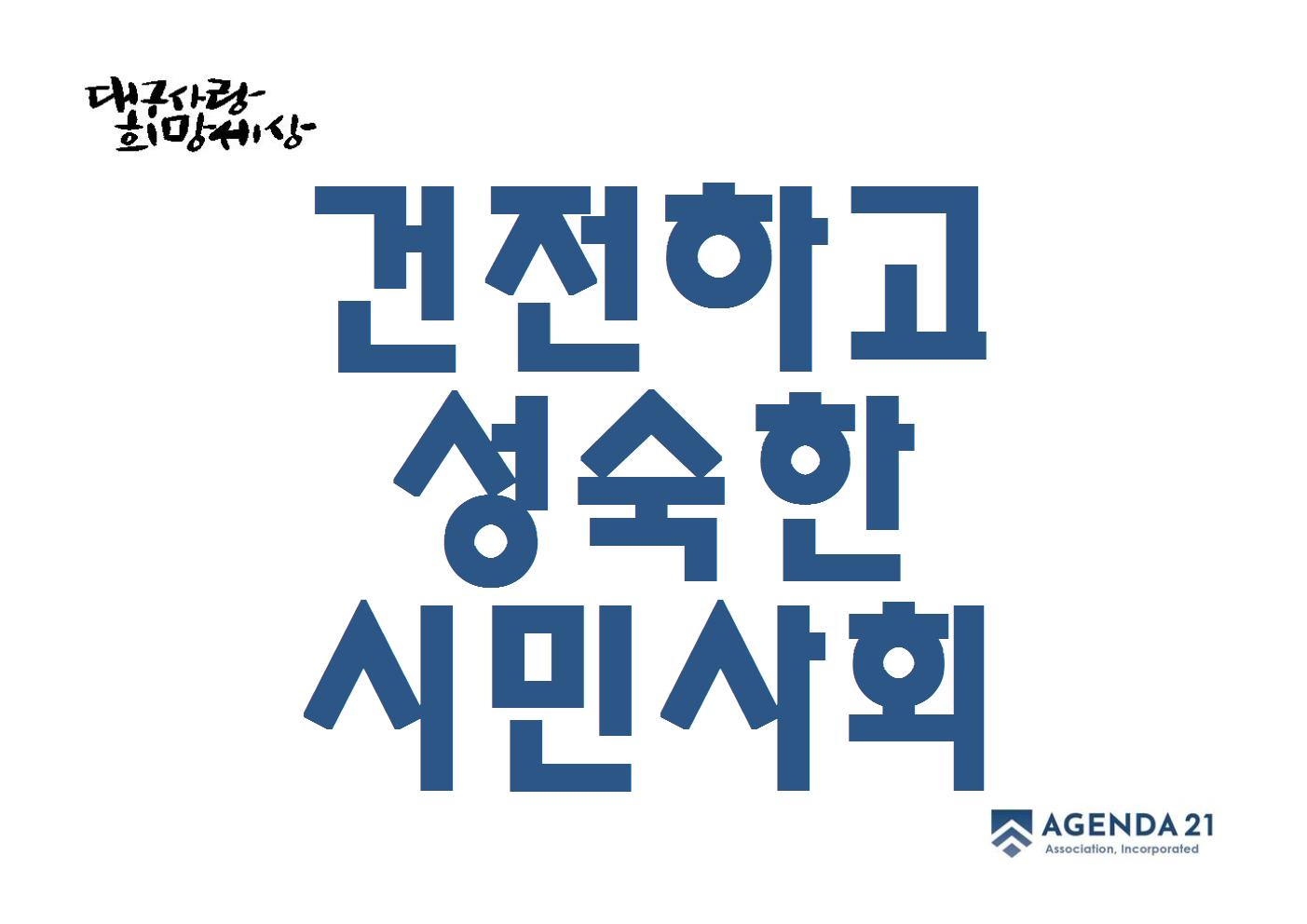 (사)아젠다21은 건전하고 성숙한 시민사회를 추구하며 대구사랑 희망세상을 실천하고자 합니다.